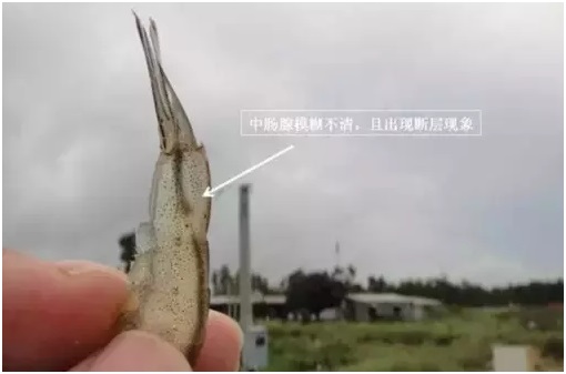 消化道变红、肿胀和混浊等症状从体外就可看清。解剖病虾,取出消化道,从胃、中肠和直肠剪开各取一小段,将肠壁用压片法,在高倍镜下检查血细胞聚集和红色素细胞扩张的情形。