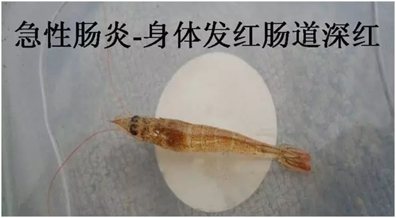 肠炎病是对虾养殖中比较常见的疾病之一,整个养殖周期均常见。病虾的消化道变红色,急性感染时胃部最明显,中肠后部也变红或肿胀,直肠(后肠)变混浊。失去弹性,肠道内无食物,严重者肠粘膜坏死脱落,肠道内积脓或积液。肠壁红色素细胞扩张,有大量血细胞聚集。肠道出现断节,拖便等情况,病虾不活泼、厌食、生长缓慢。