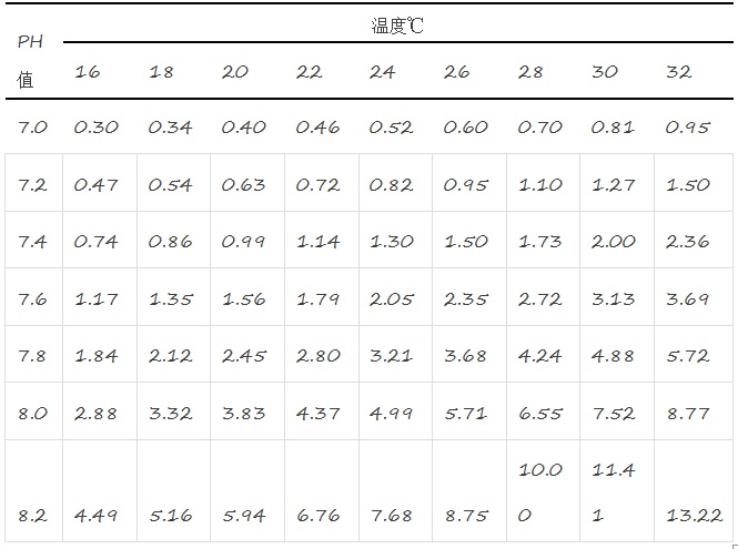 在养殖生产中,通常测的氨氮是指池塘水体的分子氨和离子氨的总和,两者之间存在着一个动态平衡关系:NH3+H2ONH4++OH-,分子氨和离子氨各自占氨氮的比例主要受ph和温度的影响。对水生动物危害较大的是分子氨,而离子氨目前主流观点认为基本是无毒的。在养殖实际操作中,因为分子氨不能直接测定,只有通过测总氨氮的方法来测算水体中分子氨的含量,不同PH和温度下分子氨占总氨氮的比例可以通过表1查得。