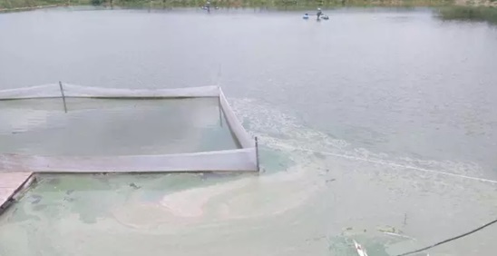 物理方法处理蓝藻的方法主要有3个,一是在有风的晴天上午,全塘干洒面粉,不计水深,用量为5斤/亩,连续2-3天,然后将面粉和蓝藻的结块后形成的团状物用捞网人工捞除,根据实际情况增减天数。如果养殖面积不大,蓝藻爆发得不是特别剧烈的话,还可以用一根竹竿或者塑料管将蓝藻围到一个小角落,在晴天下午在下风处用捞网人工捞除。