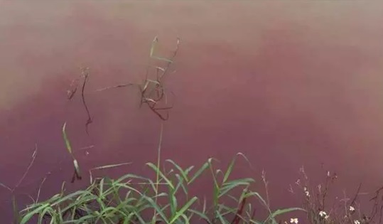 其次是池塘急性倒藻引起的水体发红。产生原因是由于池塘缺氧而引发藻类大量死亡。其红色产生的机理有两方面:一方面是水中溶解态有机质、悬浮物质(饲料残渣、死藻等有机颗粒)对光照的折射与反射;另一方面是由于池塘底质对水色的间接影响。