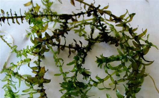 3.伊乐藻。伊乐藻发芽早,长势快,在早期其他水草还没有长起来的时候,只有它可认为河蟹生长、栖息、蜕壳和避敌供应理想场所。这种草不耐高温,而且生长茂密。当水温达到30℃时,基本结束生长,也容易臭水,因此这种水草的笼罩率应节制在20%以内,养殖户能够把它作为过渡性水草进行种植。