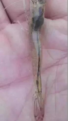 图4 治疗之前,对虾体表色素细胞加深,肠道发红