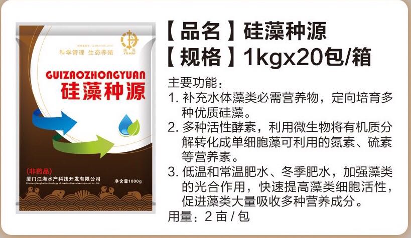 硅藻种源,专门为培育硅藻而设计的配方,定向培育硅藻,内含硅藻藻种、硅酸盐、单细胞藻类分裂素及藻类所需微量元素,可单独使用或配合丰贝素,广泛应用于花蛤、蛏、鲍鱼、海参、海胆、海蛎育苗与养成池的肥水。